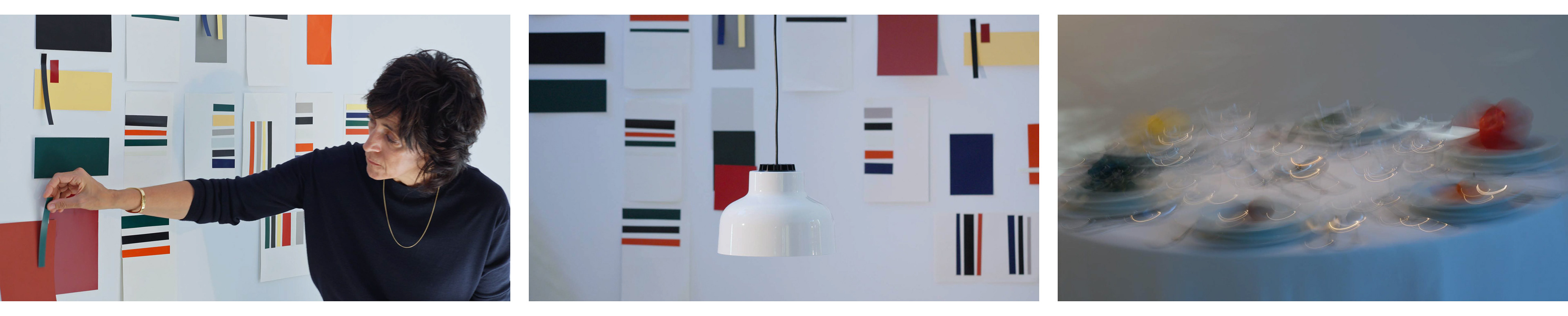 Captación de diferentes momentos en el proceso de creación artística de los colores de Claudia Valsells para la creación de la paleta de colores de la lampara M64 de la editora de diseño Santa&Cole.
